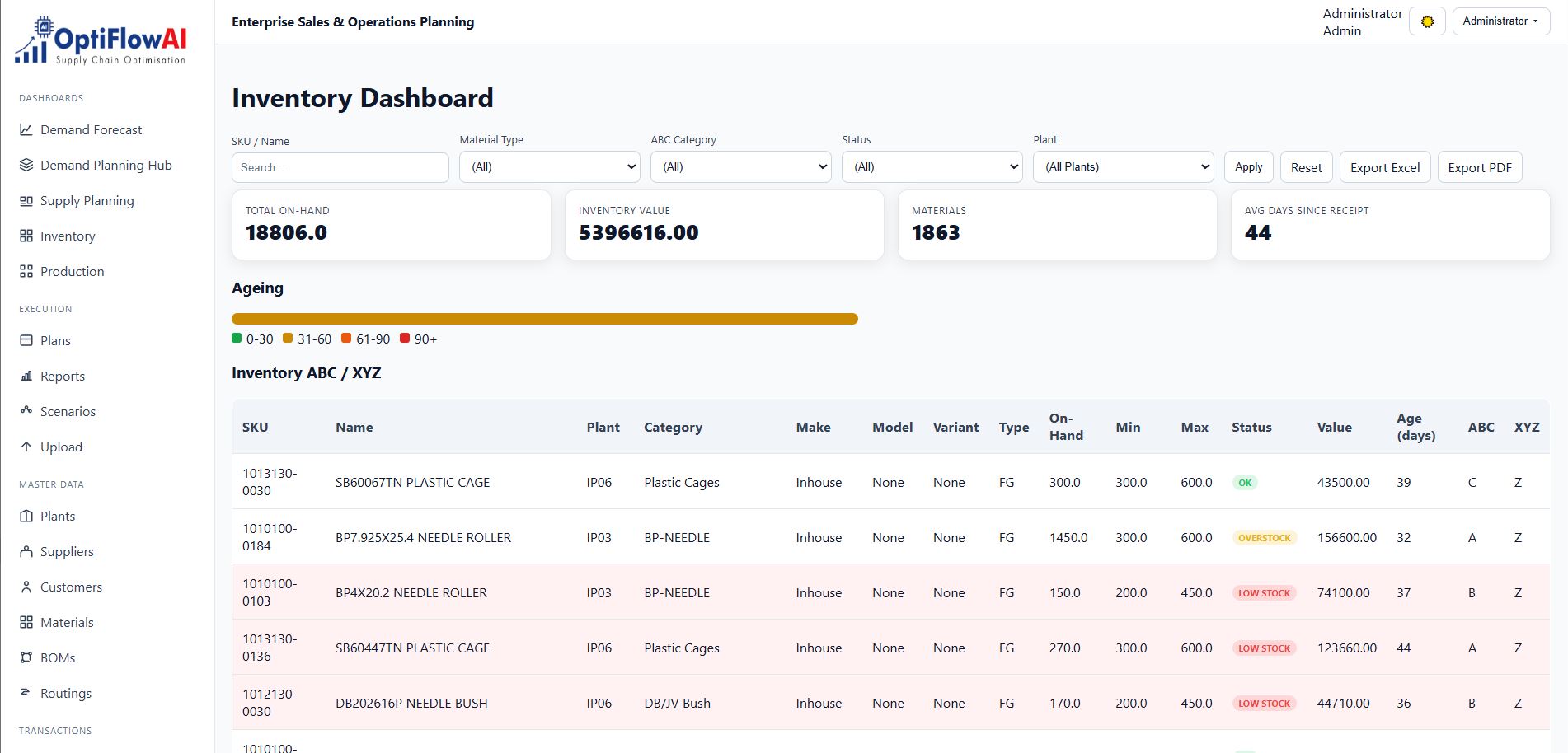 Traditional S&OP processes rely on monthly snapshots that are often outdated before the meeting ends. OptiFlowAI continuously ingests demand signals and maps them against live capacity, inventory positions, and supplier lead times. Key capabilities include: